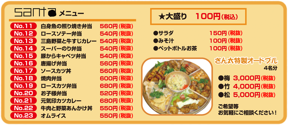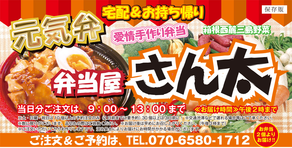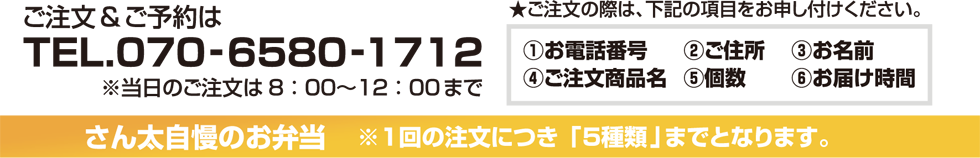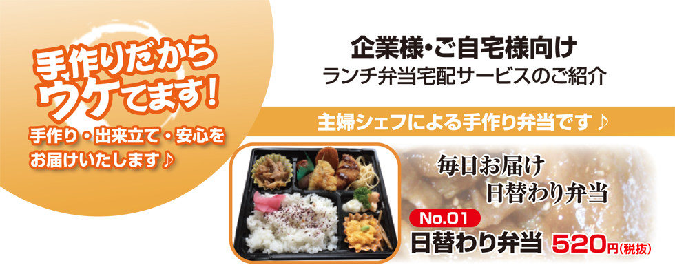 宅配&お持ち帰りにて、日替り弁当を承っております。 まずはお気軽に、電話でお問合わせ下さい。