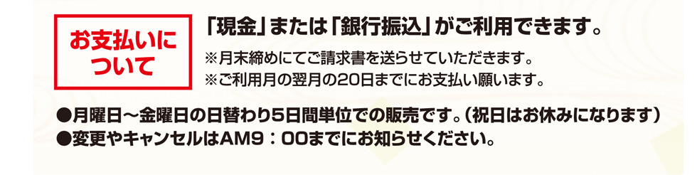 ※ 土・日・祝日は10個以上の予約注文のみ(2日前までに要予約) ※ 30個以上は3日前に! ※ 交通渋滞などで遅れる場合等はご了承ください。 ※ 数に限りが御座います。品切れの際はご容赦ください。 ※ お届け後は早めにお召し上がりください。(午後3時まで) ※ ご注文いただいてからお作りしますので、混み具合によりお届けにお時間が掛かる場合がございます。